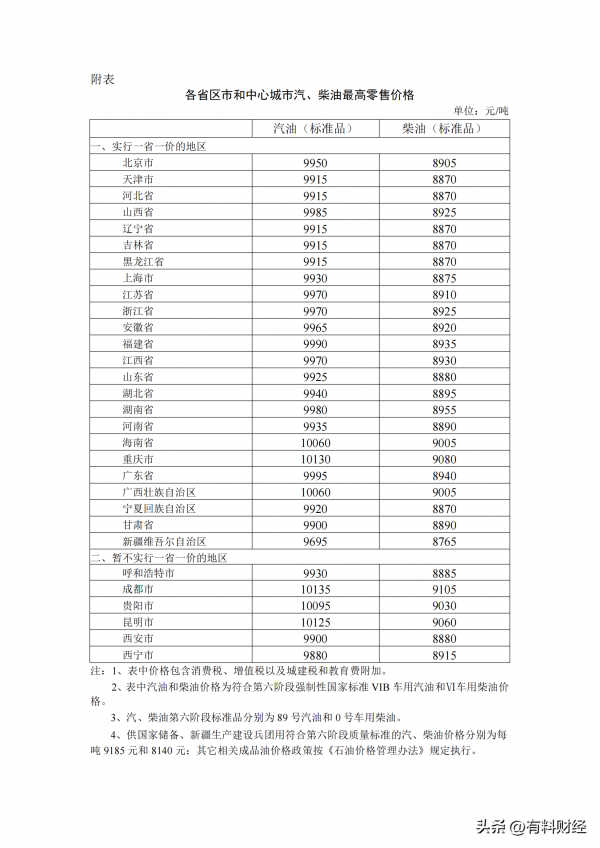 有料财经:黑龙江、陕西、辽宁、新疆、四川、青海、贵州、内蒙古、西藏、云南成品油价格暂不实行一省一价。