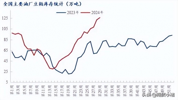 往年当国内豆粕库存提高至100万吨以上时,油厂大概率出现豆粕胀库、价格下跌现象。今年6月中旬国内油厂豆粕库存突破100万吨后,又持续上升至今,达到124万吨高位,豆粕供给压力凸显,价格持续下跌。