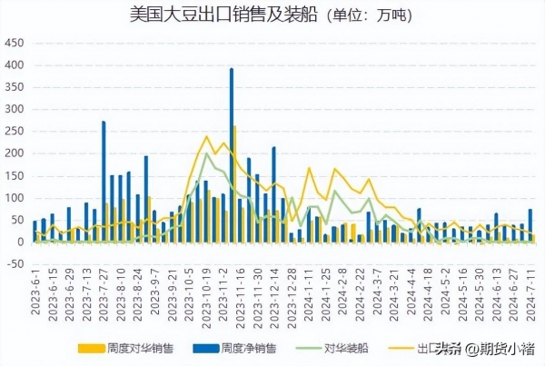 美国农业部公布的周度大豆出口销售数据符合预期。数据显示,截至2024年7月11日当周,美国当前市场年度大豆出口销售净增36.01万吨,较之前一周增加73%,较前四周均值增加13%。