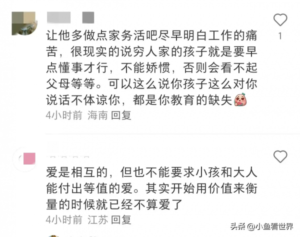 网友质问你从小教孩子什么是金钱什么是工作什么是理财吗?你带着孩子让他自己实践过吗?如果从小都是有求必应,在孩子的概念里,金钱就是他张张嘴就会得到的东西,不会去思考这代表了什么的。