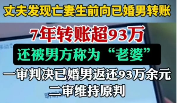 浙江宁波,男子整理亡妻遗物时,突然发现妻子生前跟另一男子关系暧昧,妻子叫对方"哥哥",对方则唤妻子"老婆",而且,他们交往7年间,妻子给对方转账高达93万余元。男子瞬间崩溃,他没想到同床共枕过这么多年的妻子,竟能干出这种荒唐事。为了不让夫妻共同财产便宜旁人,男子与女儿、岳父一起将男子告上法庭,要求全额返还。谁知男子辩称:我两是合伙人,一起做生意而已!