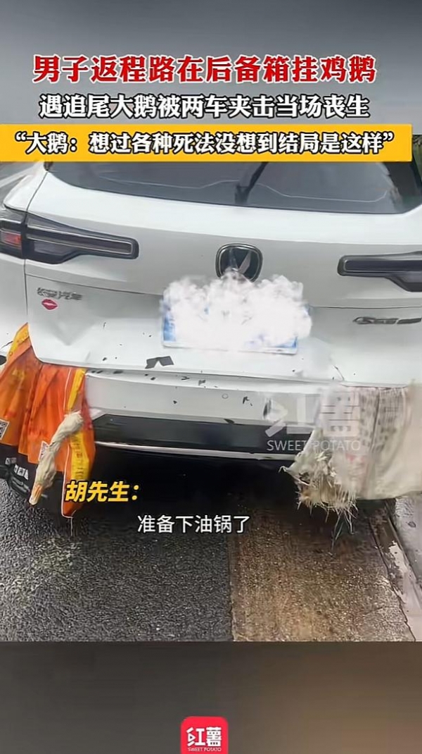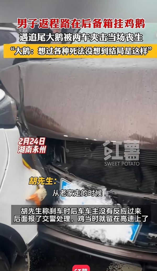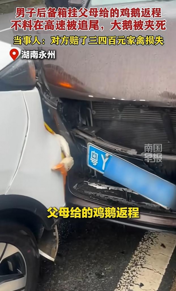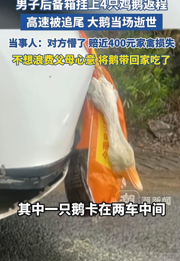 当日,车辆行驶至湖南永州境内时,距离广东目的地仅剩300公里,眼看就要顺利抵达,前方路况突然突变,胡先生下意识猛踩刹车,车辆紧急减速。可紧随其后的后车因跟车过近,司机反应不及,伴随着一声剧烈的撞击声,狠狠撞在了胡先生的车尾。剧烈的撞击力瞬间传递到后备箱外侧,挂在上面的鸡鹅被当场挤压、撞击,无一幸免,其中一只大白鹅还正好卡在两车缝隙之间,场面十分尴尬。