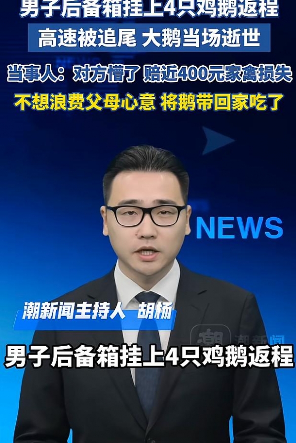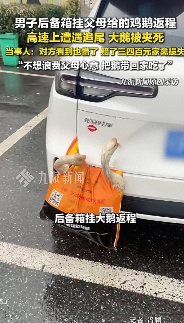 春节返程的后备箱,装满了父母沉甸甸的牵挂,可湖北襄阳一位男子的返程之路,却因一个"聪明反被聪明误"的举动,酿成了一场既滑稽又心酸的意外。2月24日,胡先生驾车从湖北襄阳返回广东上班,临行前父母特意为他准备了4只自家散养的活鸡活鹅,让他带回城里尝尝家乡味。担心密闭的后备箱会把鸡鹅闷死,辜负父母的心意,胡先生想出一个"妙招"--用绳子将2只鸡、2只鹅牢牢挂在后备箱外侧,本以为能两全其美,不料行至湖南永州境内时,遭遇追尾事故,挂在车尾的4只鸡鹅当场全部死亡,场面既狼狈又令人心疼。