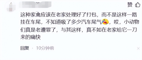 这种家禽应该在老家处理好了打包,而不是这样一路挂在车尾,不知道吸了多少汽车尾气,哎,小动物们真是老遭罪了,与其这样,真不如在老家给它一刀来的痛快
