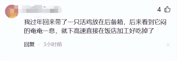 我过年回来带了一只活鸡放在后备箱,后来看到它闷的奄奄一息,就下高速直接在饭店加工好吃掉了