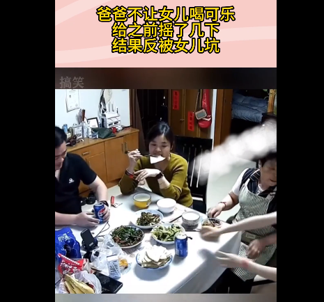 据视频显示,一家人坐在饭桌上准备吃饭,爸爸不让女儿喝可乐,给女儿之前摇了几下,结果反被女儿坑,可乐直喷爸爸脸上。