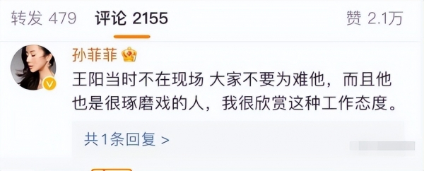 她迅速地写了一篇微博,公开为王阳澄清,表示他并不是事件的参与者,在她记忆里,王阳当年在剧组也常常受排挤,甚至会私下和她吐槽导演的种种不是。