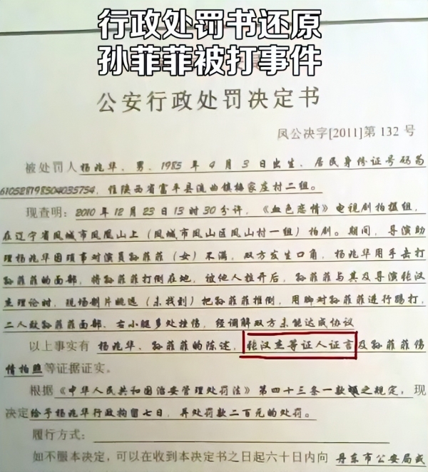 孙菲菲找到张汉杰理论,结果又被现场制片姚某殴打,当时经过调解之后双方没有达成协议,杨某被行拘7天并被处罚金。