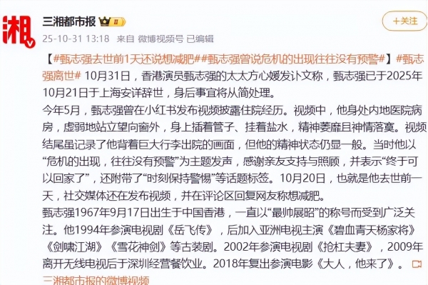 前亚视小生甄志强的告别仪式于11月16日在世界殡仪馆举行,横匾上"永远怀念"四字,道尽了在场所有亲友的沉痛。这位曾在荧幕上留下"最帅展昭"经典形象的演员,于今年10月21日在上海安详辞世,终年59岁。灵堂布置素雅,中央摆放着遗孀方心媛致献的心形花牌,挽联上"永怀心扉"的字句,无声诉说着未亡人的刻骨哀思。