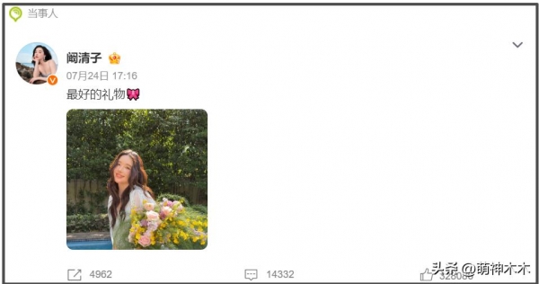 2025年7月24日,阚清子官宣怀孕,她发布了一张轻抚自己肚子的孕照,满脸幸福,配文感慨最好的礼物;