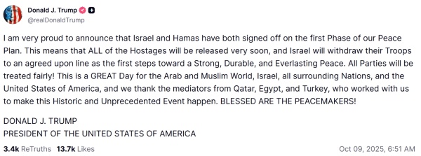 特朗普在贴文中表示:以色列与哈马斯双方均已签署我们和平计划的第一阶段协议。这意味着所有被扣押人员即将获释,以色列军队也将撤至双方商定的边界线--这是迈向强大、持久且永恒和平的第一步。各方都将获得公平对待!
