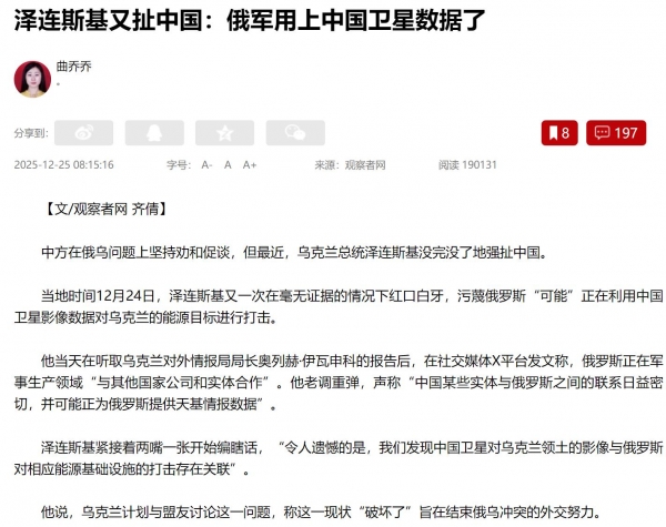 这还没完,泽连斯基日前再一次没有依据的对华泼脏水,污蔑俄罗斯"可能"正在利用中国卫星数据,对乌克兰能源目标等发动军事打击,他将向西方盟友进行通报,暗示要纠集美西方共同报复中国。