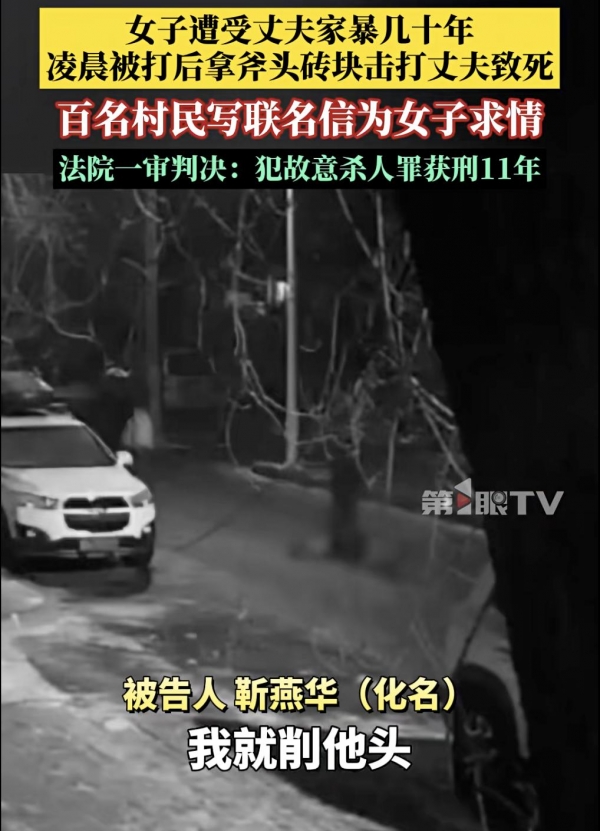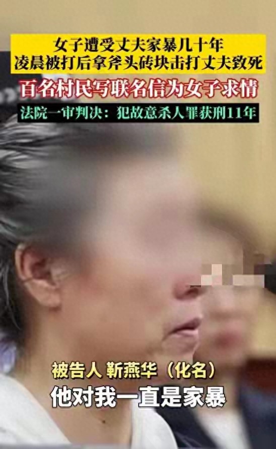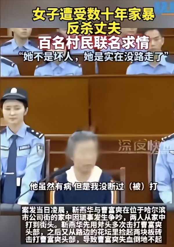 2026 年 1 月,哈尔滨一名女子靳燕华(化名)将丈夫曹富爽(化名)杀害,这起由长期家暴引发的命案,随着庭审结束引发广泛关注。庭审现场,百名村民联名上书请求从轻处罚,所有家属亲属也明确表示谅解,但法院最终以故意杀人罪判处靳燕华有期徒刑 11 年。