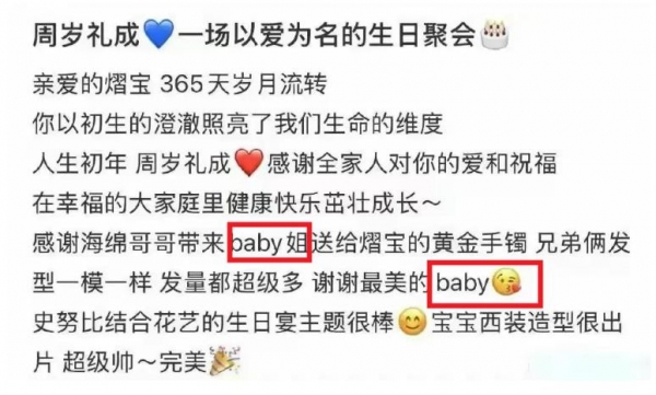 另外,黄晓明表弟的儿子过1周岁生日,一大家子都现身去表弟家祝贺,黄晓明也去了。杨颖因身份原因,并没有到场,但却买了黄金手镯叫小海绵送过去。事后,表弟媳更是特意发文隔空感谢了baby。