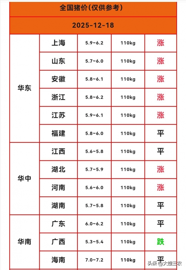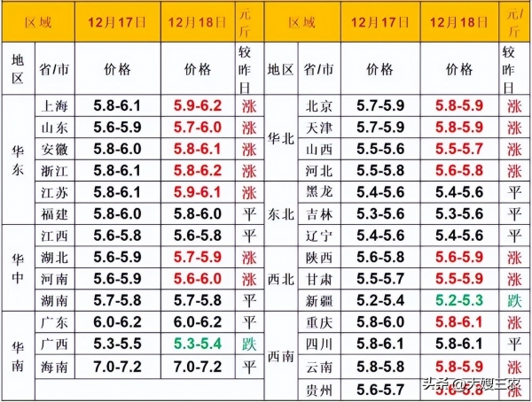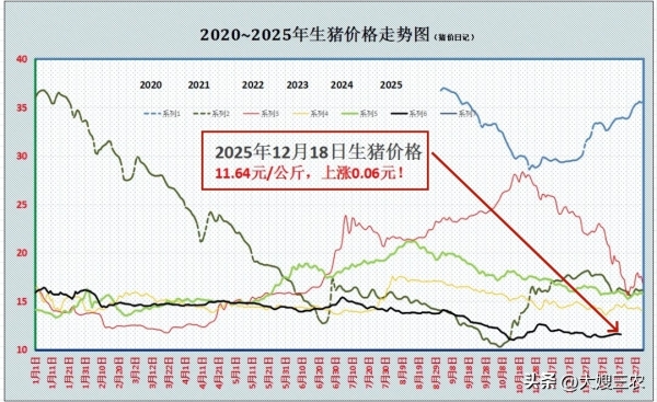 12月18日生猪均价上涨0.06元/公斤,均价反弹到11.64元/公斤,也就是5.82元/斤,一举收复5.8元/斤关口。