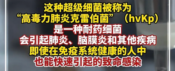 这种超级细菌被称为"高毒力肺炎克蕾伯菌"(hvKp),是一种耐药细菌会引起肺炎、脑膜炎和其他疾病。即使健康的人也能快速致命感染。