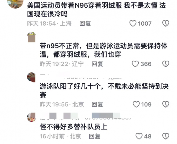 网友说"游泳运动员穿羽绒服正常,但是带N95是什么意思?不懂就问""游泳队阳了好多了""怪不得许多替补队员上场"。