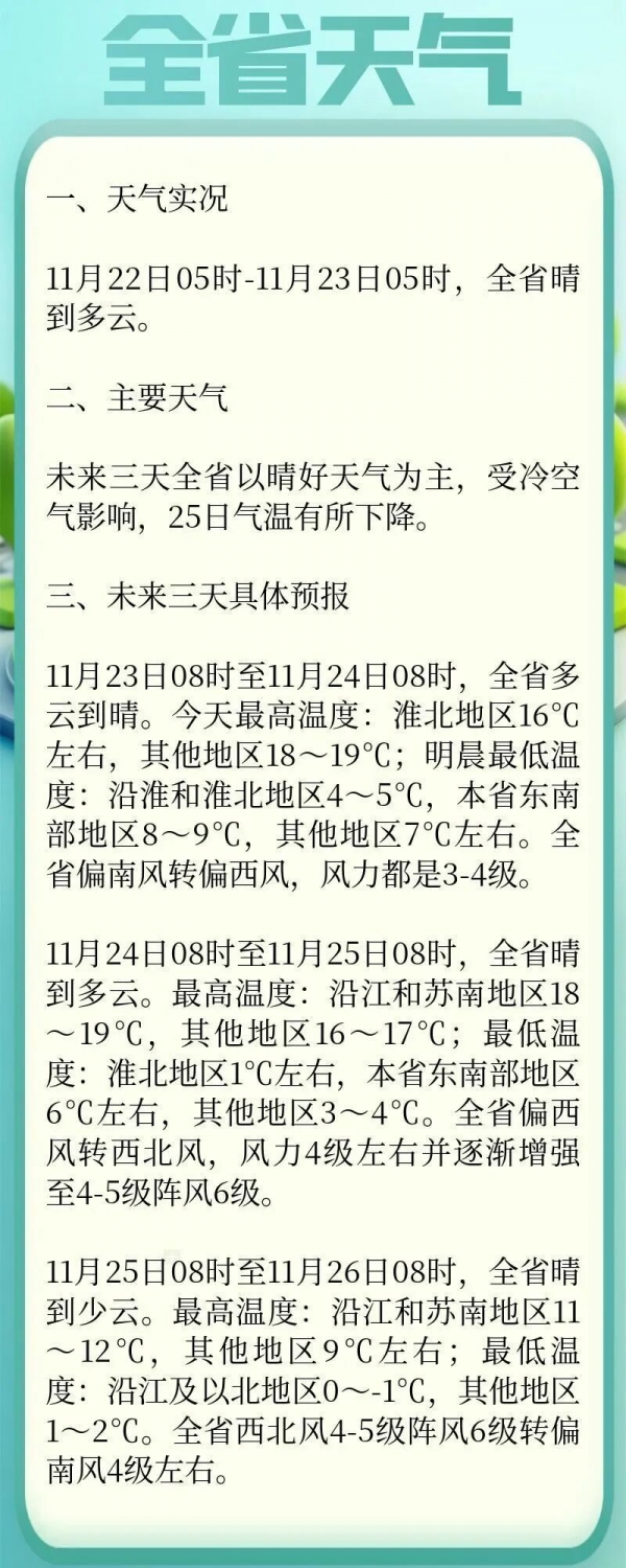 【未来三天全省以晴好天气为主,受冷空气影响,25日气温有所下降】