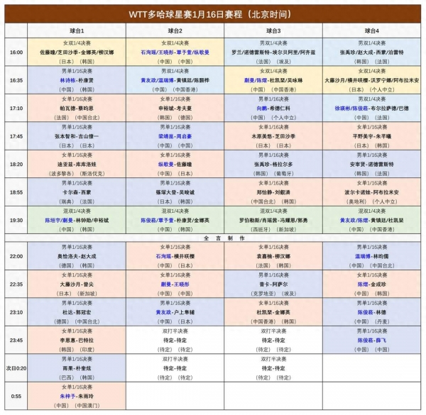 2026年WTT多哈球星赛1月16日赛程正式公布,中国队将在当日迎来多场关键对决,涵盖男女单、男女双及混双多个项目,从下午16点至次日凌晨,国乒选手将在多哈赛场展开密集征战,冲击各单项晋级名额。