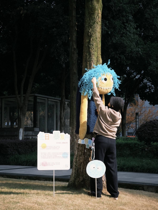 12月10日,记者联系到抱树娃娃的设计团队"白日梦想家计划",品牌发起人Megan表示,抱树娃娃是自己的团队与渝兴广场园区管理方合作策划的艺术展览,"11月初园区联系到我们,说希望通过一些装饰给园区带来活力和温暖,所以我们就策划了名为'美好一天'的展览,也就是大家后来看到的抱树娃娃。"