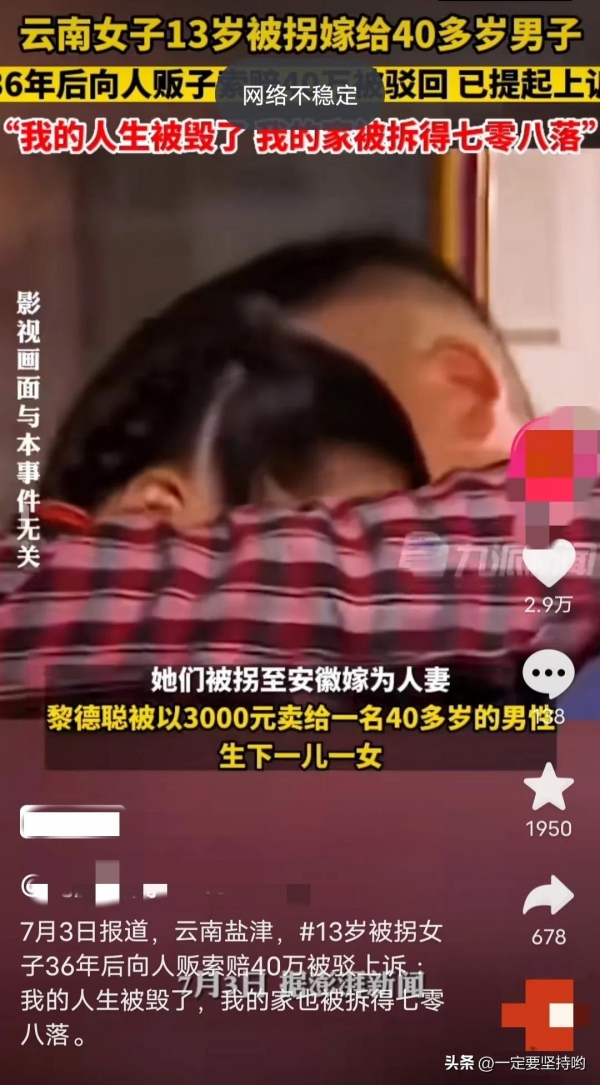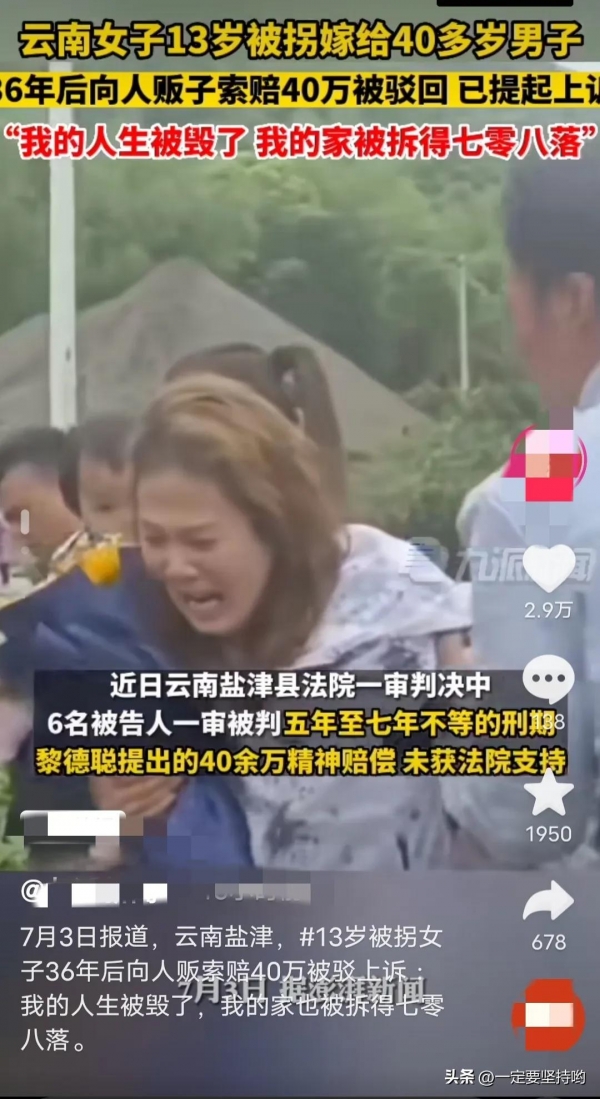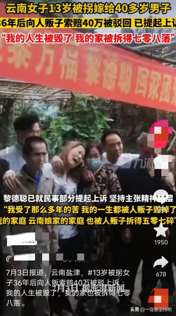 7月3日,据报道,在云南盐津,一名13岁的女子被拐36年才回到自己的家乡。为了给自己讨回公道,女子向人贩索赔40万被驳回!