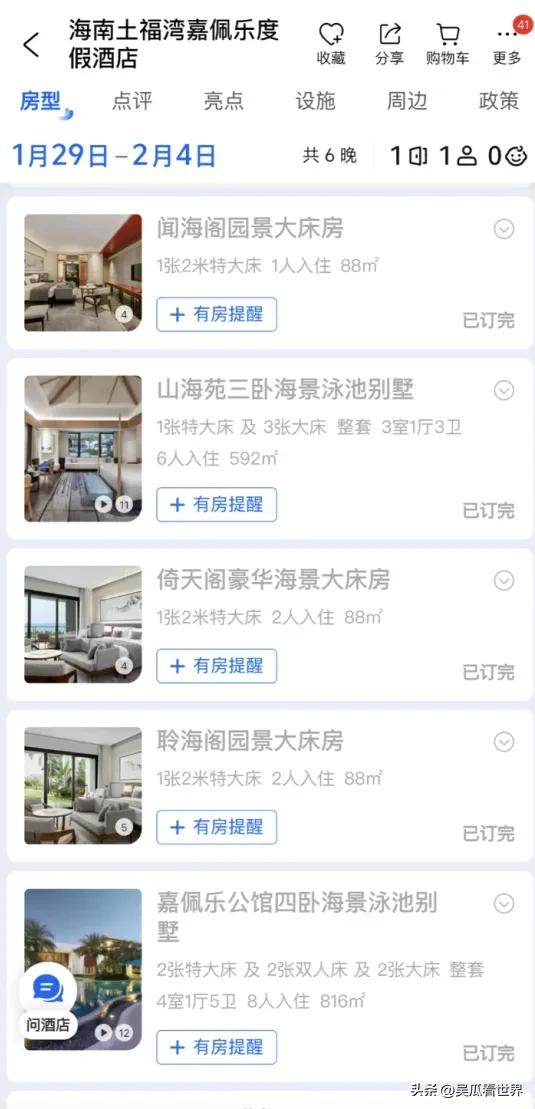 而海南土福湾嘉佩乐度假酒店更加恐怖,220243元一晚的"四卧海景泳池别墅"、30185一晚的"逸水居"-五十豪华泳池别墅"等房型,也被订完了,可见现在三亚的热度非常高。