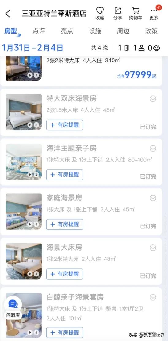 还有12天才到春节,但三亚大部分酒店已经出现房型被订光的情况,比如三亚非常出名的亚特兰蒂酒店,在春节期间,1988元的低价房型早不见踪影,特大双床海景房、海洋主题亲子房、海景大床等房型,已经全部被订完了。