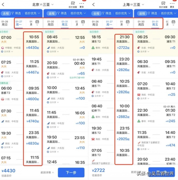 从上海飞三亚的航班价格基本在3000左右,而北京飞上海的机票达到5000元左右,相比一月中旬上涨了接近1倍,相比去年12月的价格涨了差不多2倍。