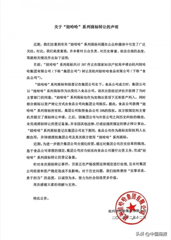 娃哈哈称,"娃哈哈"系列商标共计387件正在国家知识产权局申请由杭州娃哈哈集团有限公司转让至杭州娃哈哈食品有限公司。