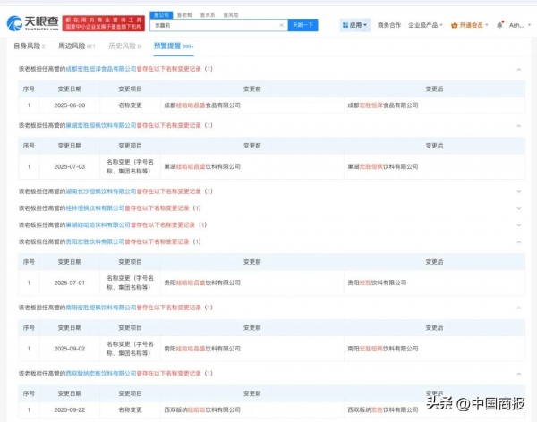 值得关注的是,近期娃哈哈旗下多家公司接连更名,9月以来已有多家企业更名为"宏胜系",包括西双版纳宏胜饮料有限公司、宜昌宏胜饮料有限公司等。此外,今年以来已有超十家娃哈哈旗下公司发生工商变更,企业名称变更为宏胜,包括杭州宏胜恒泽饮料有限公司、白山宏胜饮料有限公司等。