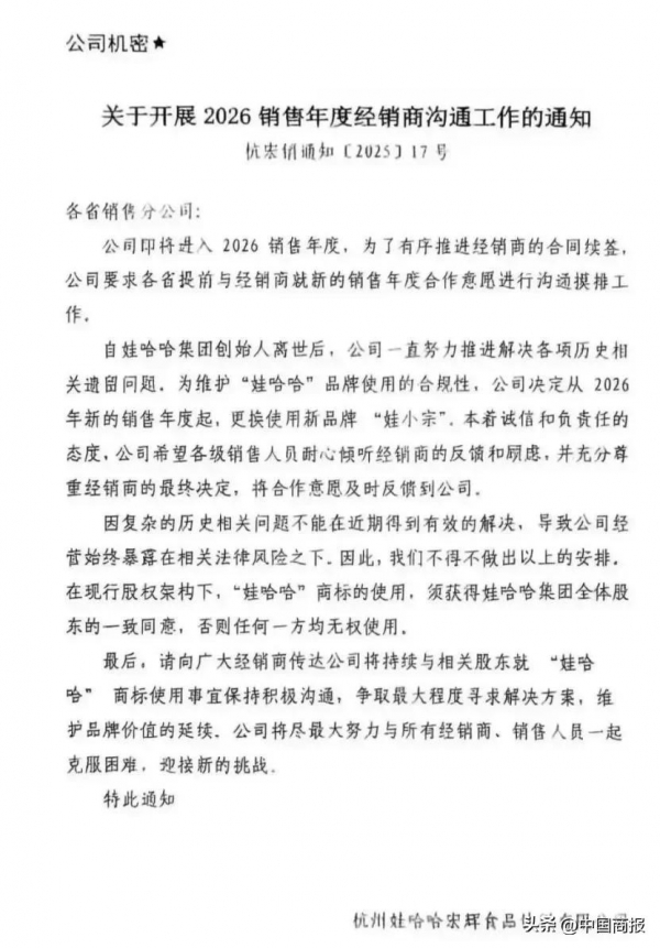 此前,一份《关于开展2026销售年度经销商沟通工作的通知》(以下简称通知)显示,自娃哈哈集团创始人离世后,公司一直努力推进解决各项历史相关遗留问题,为维护"娃哈哈"品牌使用的合规性,公司决定从2026年新的销售年度起,更换使用新品牌"娃小宗"。