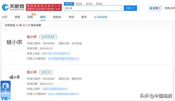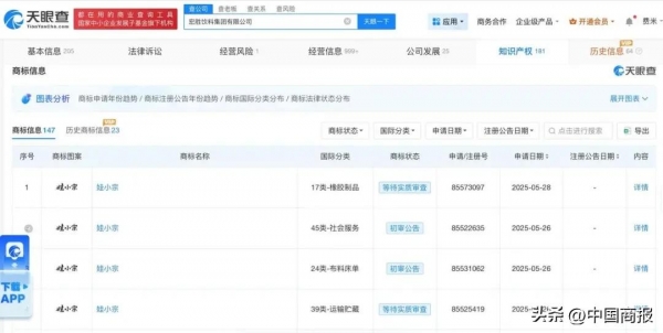 工商信息显示,宏胜集团已为"娃小宗"注册了涵盖食品、啤酒饮料、方便食品等多个品类的商标。