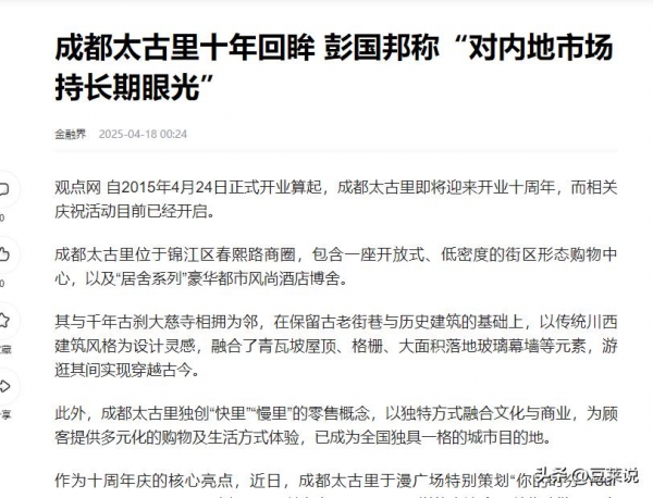 信息来源:成都太古里十年回眸 彭国邦称"对内地市场持长期眼光"