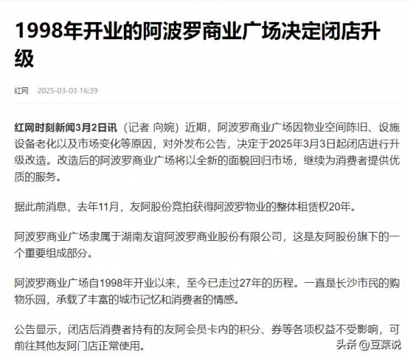 长沙阿波罗商业广场撑了27年,最后还是贴出了闭店改造的通知,南京第一家奥特莱斯开了20年,终究没能扛过行业寒冬。