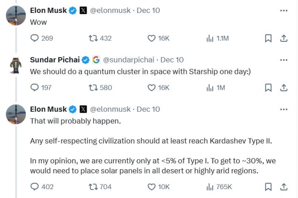 对此,谷歌CEO皮查伊在X(原推特)上发布了Willow芯片的介绍,引来了马斯克的点赞。在皮查伊回复"我们应该用星舰在太空中建立一个量子集群"后,马斯克表示"确实如此"。