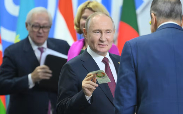 俄罗斯总统普京在最近的一次峰会上拿着一张看起来像金砖国家钞票的东西。 《华尔街日报》