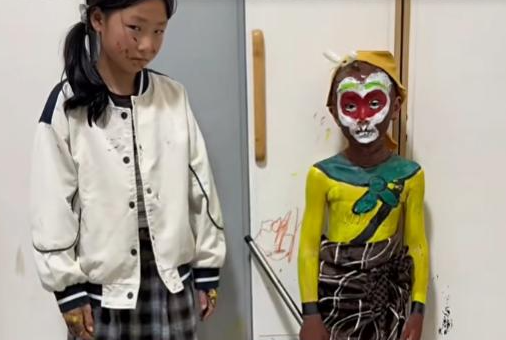 家长推门进去查看的时候,正好姐姐在给弟弟涂黑色的脚及脚指甲。看到家长进来,姐姐表情也是很震惊,姐姐脸上,手上,白色的外套上也沾满了颜料。