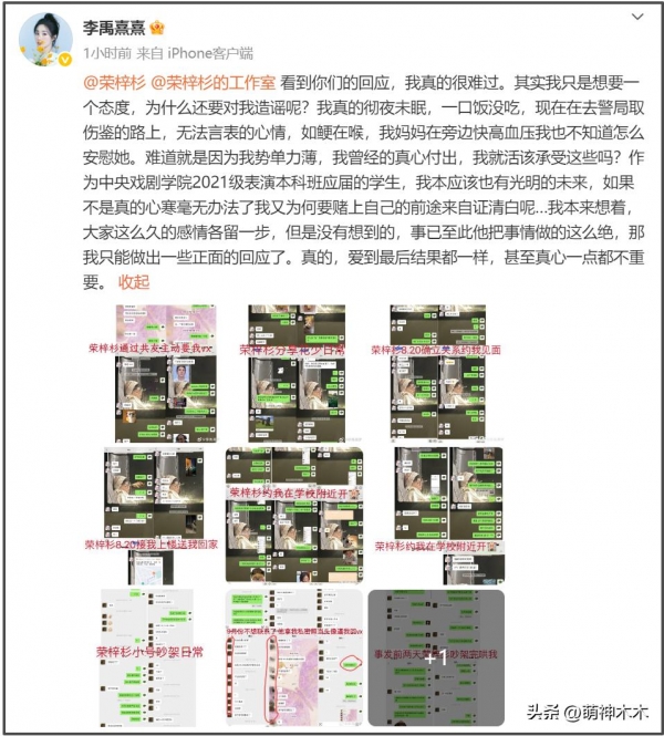 李禹熹坦言如果不是真的心寒,毫无办法了,自己不会赌上自己的前途来自证清白:"我本来想着,大家这么久的感情各留一步,但是没有想到的,事已至此他把事情做的这么绝,那我只能做出一些正面的回应了。"李禹熹晒出了她跟荣梓杉交往过程的聊天记录,力证两人恋爱过。