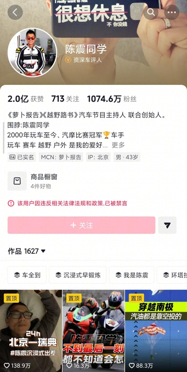 在车评人陈震偷税案件"东窗事发"后,不少曾经与其合作的车企纷纷下架相关内容。据新华社报道,陈震少缴个人所得税共计118.67万元,被追缴税款、加收滞纳金并处罚款共计247.48万元。凤凰网财经报道称,陈震在某短视频平台粉丝量1074.5万,1-20秒的广告报价35万元,21-60秒广告报价60万,60秒以上广告报价80万,吸金能力不俗,许多车企争相与其合作。