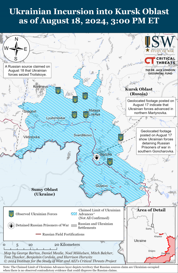 (美国智库制作的库尔斯克局势图,目前乌军已控制1150平方公里的俄领土)