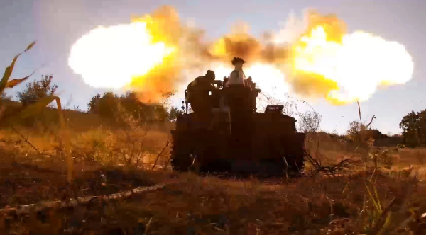 (俄罗斯国防部公布的俄罗斯士兵在库尔斯克地区向乌军阵地发射火炮的照片)