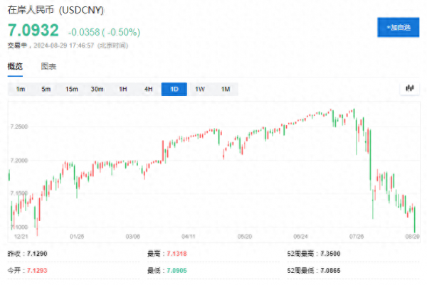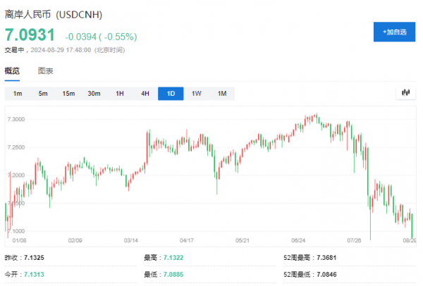 8月29日周四下午,离岸、在岸人民币兑美元双双升破7.10,日内涨幅逾300点,其中,在岸人民币创下去年12月29日以来的最高水平。