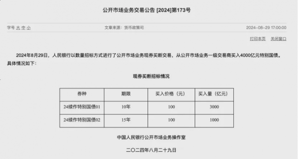 消息面上,2024年8月29日,人民银行以数量招标方式进行了公开市场业务现券买断交易,从公开市场业务一级交易商买入4000亿元特别国债。