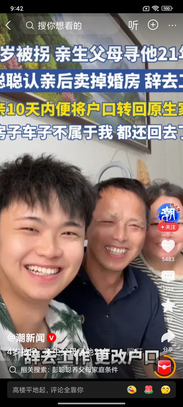 被拐21年的彭聪聪,认亲后的一连串举动令人直呼"太清醒"--当场注销养父母家户口,迅速迁回亲生父母名下,辞去工作,卖掉自己精心装修的婚房,连车带房一并还给养家,干干净净回归原生家庭!