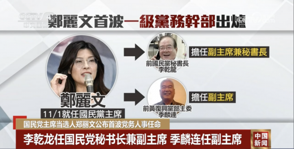 报道称,当选国民党新任党主席的郑丽文将于11月1日正式上任。郑丽文22日已公布第一波党务人事安排,国民党前秘书长李乾龙将接任副主席兼秘书长,另一名副主席为前黄复兴党部主委季麟连。
