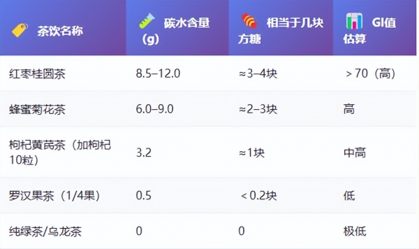 很多养生茶含大量干果、蜜饯、糖渍药材,碳水极高;"无糖"≠无碳水--红枣、桂圆、枸杞本身含糖量超70%;热水冲泡加速糖分释放,升糖速度比吃原果更快!