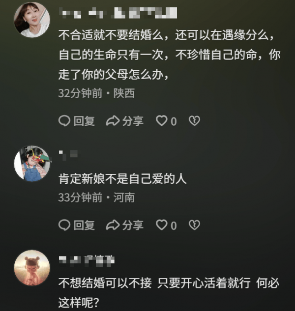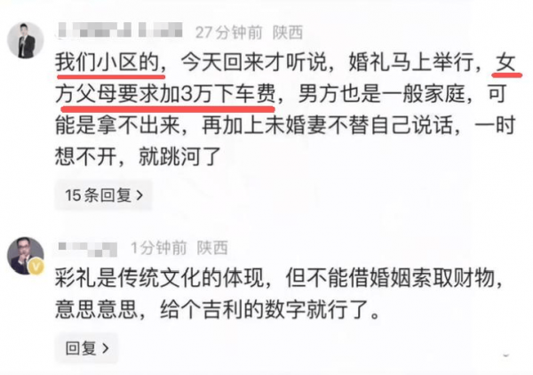 甚至还有网友说,新郎在西安一大学就职,父母都是普普通通的农民,彩礼钱都是贷款拿出来的。没想到在结婚当天却被临时要2万下车费,新郎想不过才跳江轻生。