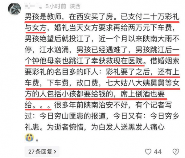 还有人说,男方是教师,在西安买了房,婚礼当天被女方要求再给2万"下车费",男子绝望后投江。母亲情绪崩溃,也跟着跳江,所幸被抢救及时,送往医院治疗。