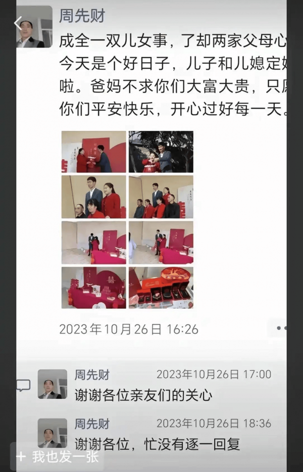 从目前已知的信息来看,周某某与未婚妻相识多年,早在2023年10月26日就已订婚。他父亲当时还在朋友圈发文祝福:"爸妈不求你们大富大贵,只愿你们平安快乐,过好每一天。"