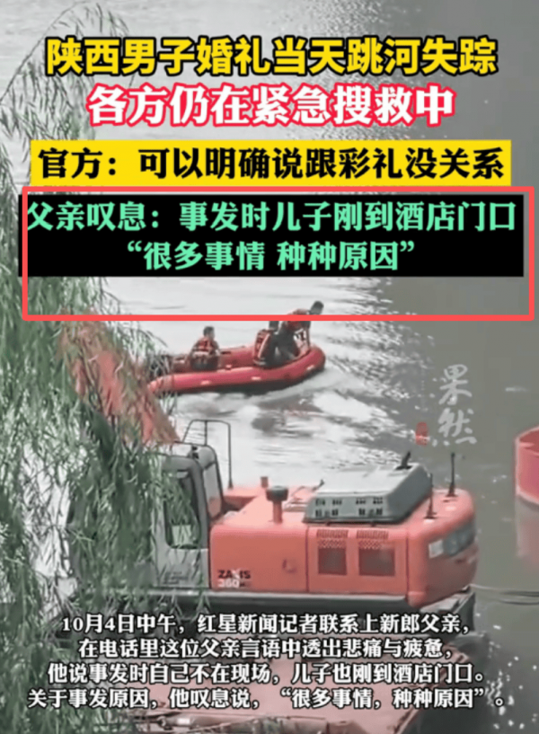10月4日,陕西旬阳市融媒体中心发布通报,称经初步调查,跳河男子为吕河镇人周某某,现年29岁。当天上午10点左右,他因婚礼琐事情绪波动,从婚礼酒店门口前往旬河大桥跳河,目前搜救和善后工作仍在进行中。